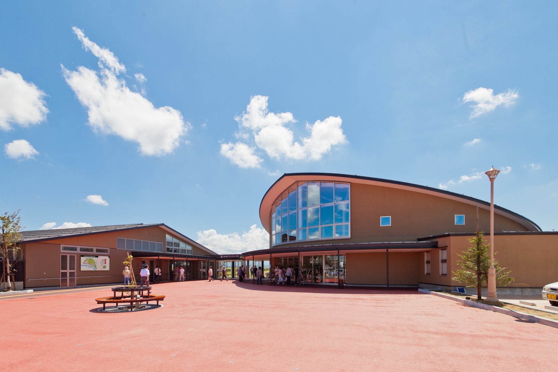 広大な芝生と築山、デイキャンプが楽しめる広場、地元産の新鮮な農産物などが数多く並ぶ農産物直売所、地元産野菜のサラダバーや、シェフ腕よりのメニューが楽しめるレストラン、日本トイレ大賞受賞のトイレ、防災アーカイブとともに防災拠点としても機能しています。