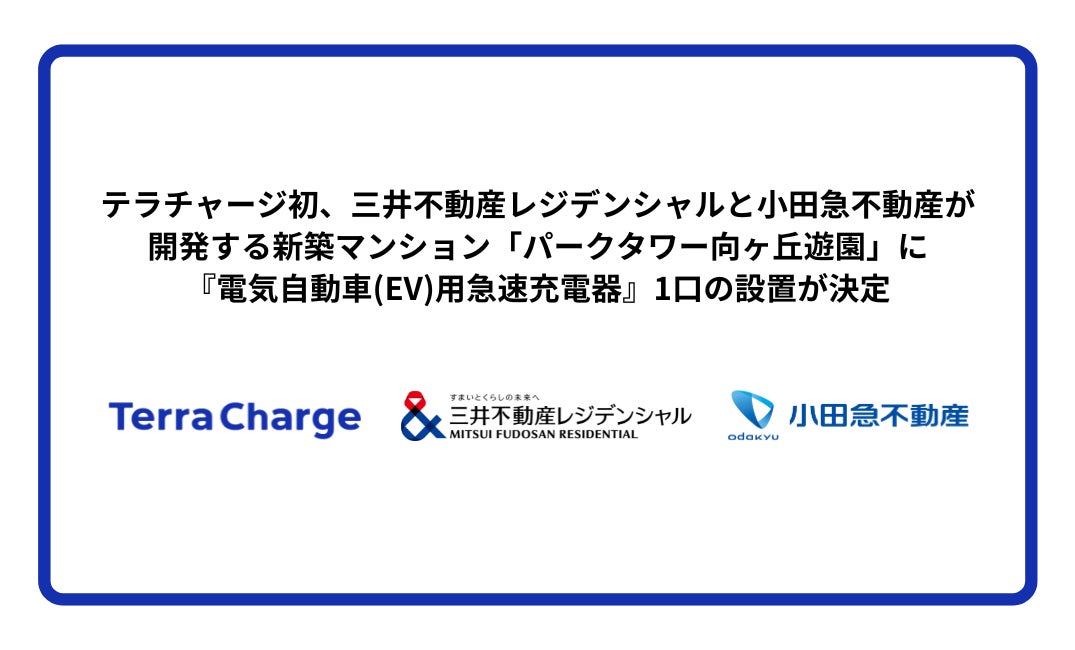 EV充電インフラ事業「Terra Charge(テラチャージ)」を展開するTerra Charge 株式会社(本社:東京都港区、代表取締役社長:徳重徹、以下「当社」)は、三井不動産レジデンシャル株式会社(本社:東京都中央区、代表取締役社長:嘉村徹)と小田急不動産株式会社(本社:東京都渋谷区、取締役社長:五十嵐秀)が開発する、新築マンション「パークタワー向ヶ丘遊園」(以下「本物件」)の駐車場に50kW出力の急速充電器1口(1基)の導入が決定したことをお知らせいたします。