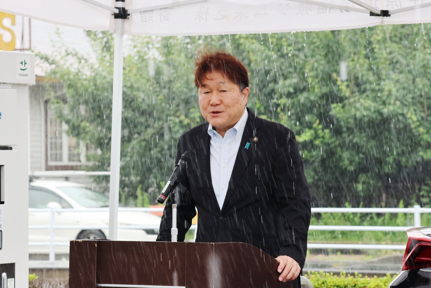 髙橋 勝浩市長がEVへの充電をデモンストレーションし、地域のEV普及を後押し
