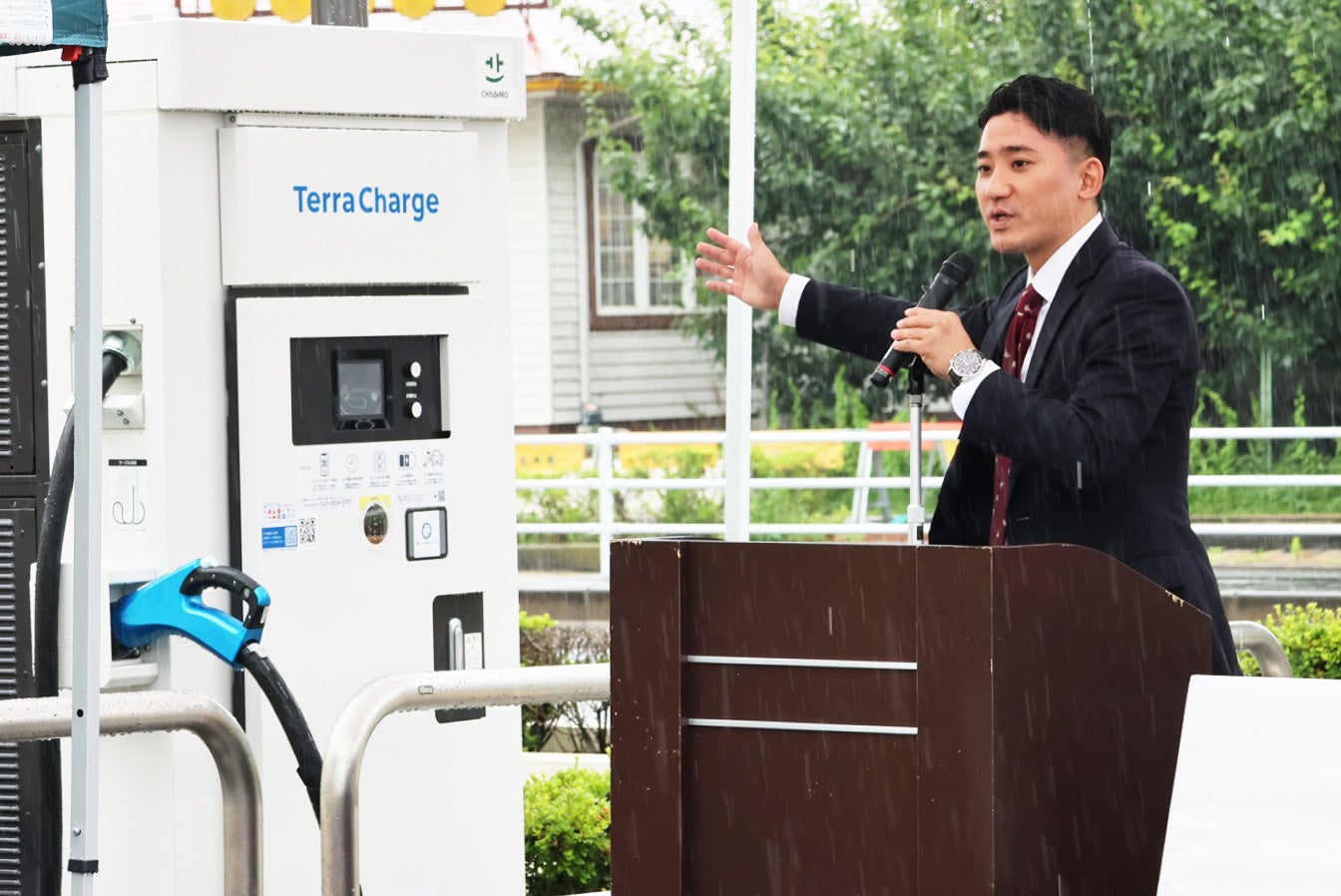 稲城市で電気自動車充電設備披露会を開催、テラチャージの150kW急速充電器の充電デモンストレーションを実施