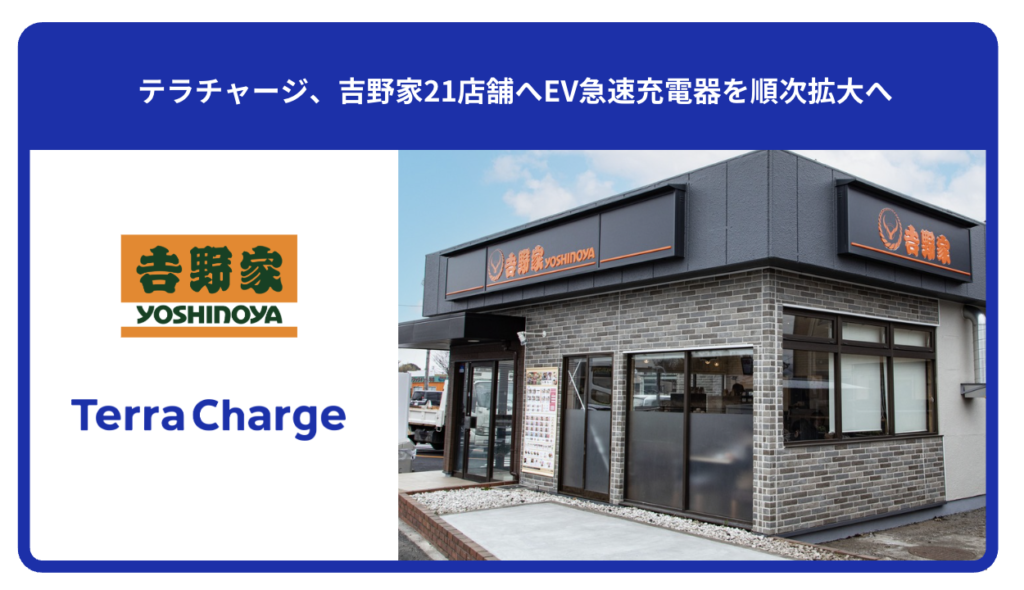 電気自動車(EV)向け充電サービス「Terra Charge(テラチャージ)」を展開するTerra Charge 株式会社(本社:東京都港区、代表取締役社長:徳重徹、以下、当社)は、株式会社吉野家(本社:東京都中央区、代表取締役社長:成瀨 哲也、以下、吉野家)が運営する全国にあるうちの21店舗へ、急速充電器を順次拡大してまいります。